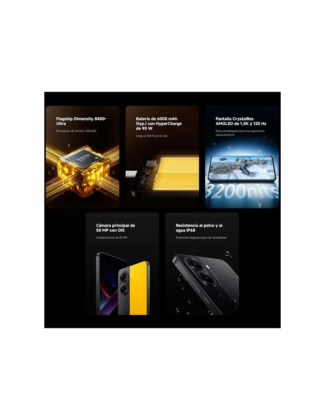Equipado con una batería de 6000 mAh y carga ultrarrápida de 90W, el POCO X7 Pro asegura horas de uso continuo y una carga de cero a cien en minutos. Con resistencia al agua y polvo IP68 y cristal protector Corning Gorilla Glass 7i, este dispositivo es altamente duradero y resistente a los golpes y caídas.