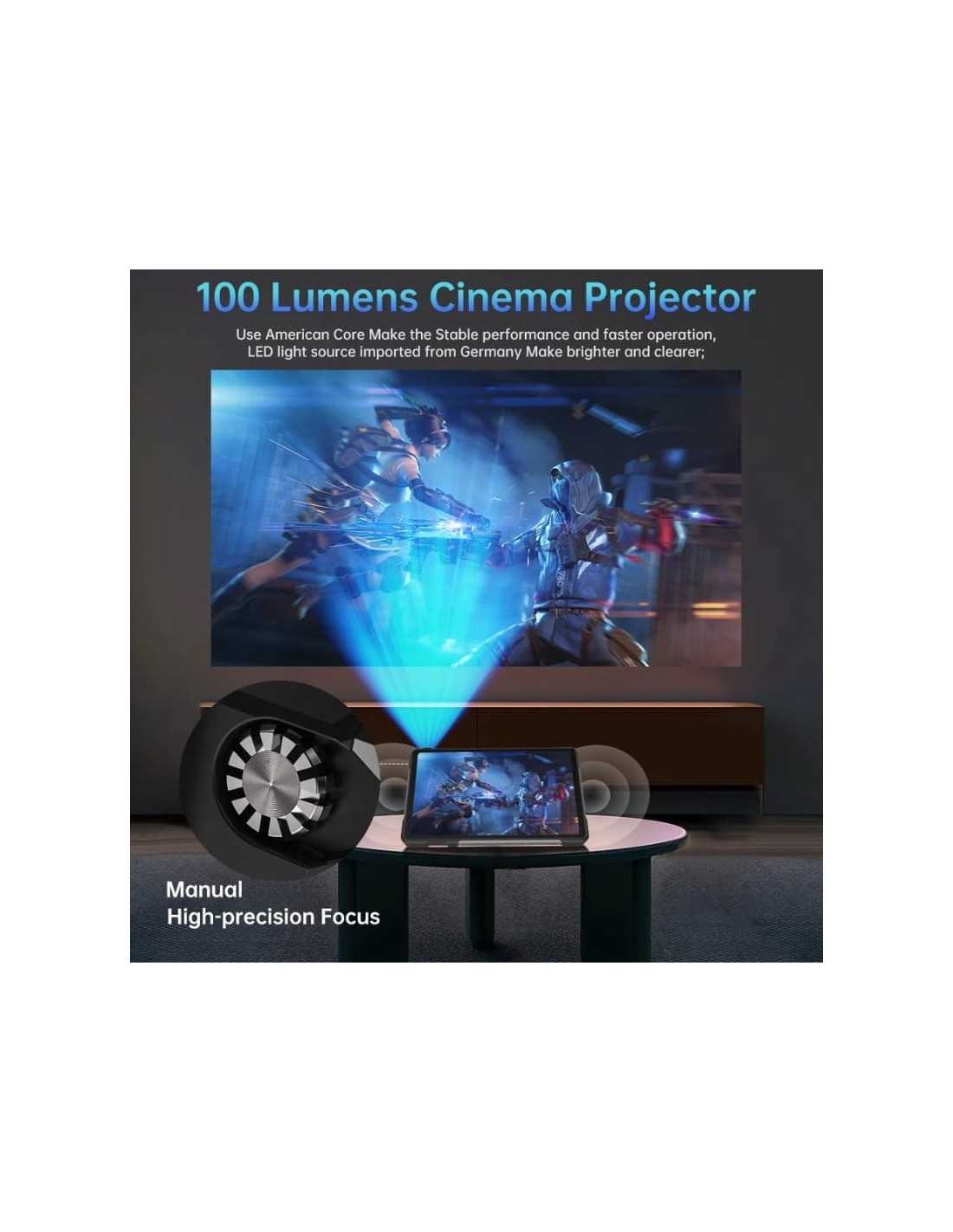- Projetor DLP: 100 lúmens, resolução 854x480, foco manual, refresco 120Hz