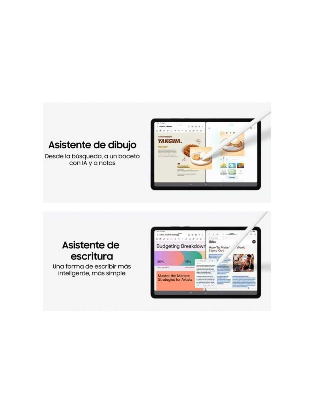 Para mejorar la productividad, cuenta con el innovador S Pen sin batería que reconoce hasta 4096 niveles de presión y las funciones de Galaxy AI como Drawing Assist y Writing Assist, que facilitan la creatividad y la captación de ideas sobre la marcha. Su diseño resistente con certificación IP68 y conectividad avanzada 5G sub-6 GHz, Wi-Fi 6, Bluetooth 5.4 y dual SIM hacen de esta tablet una opción versátil para usuarios profesionales y creativos.
